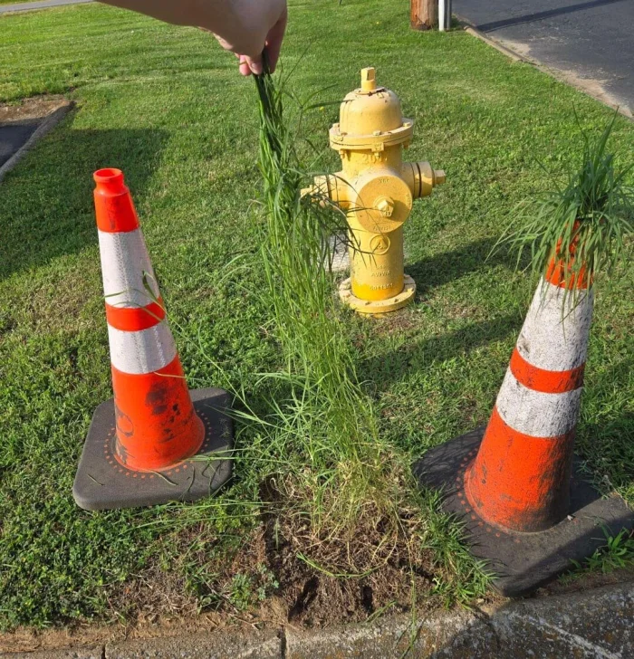 Неухоженная трава = оригинальная прическа для дорожных конусов